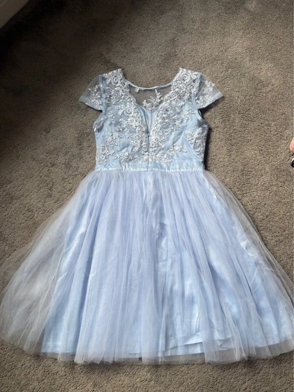 See all outfit ideasThis gorgeous baby blue Lucy Wang occasion dress features two layers of tulle and a fully lined skirt. The body showcases beautiful detailing on both the front and back. Although listed as a UK size 8-10, the tag indicates a size M, but it fits more like a size 8-10. Brand new with tags, from a smoke and pet-free home.