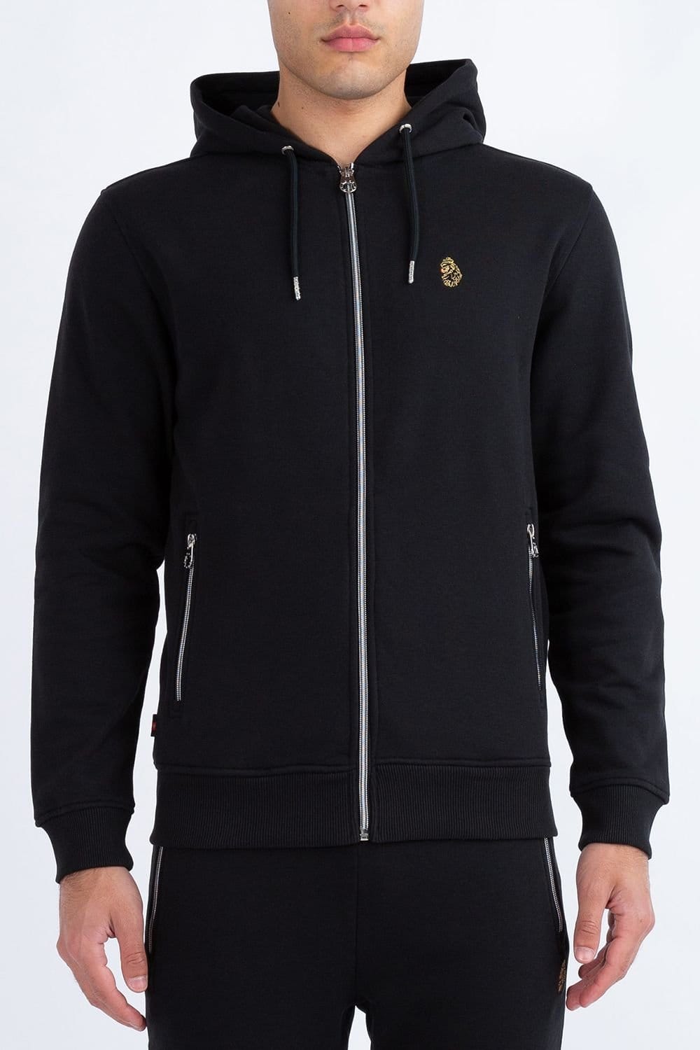 Stylish black zip-through hoodie from LUKE 1977 made from cotton fleece for warmth. Features include a chrome zip closure, ribbed trims, and a lion head embroidery on the left chest.