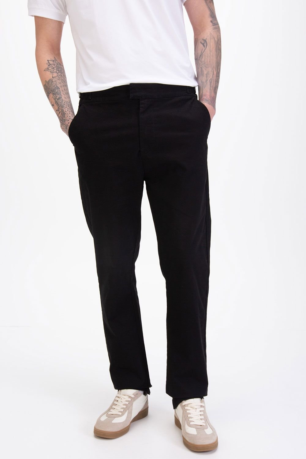 The Luke 1977 Black Cotton Blend Trouser with Buckle Detail is available in sizes 30R, 32R, 34R, 36R, 38R.