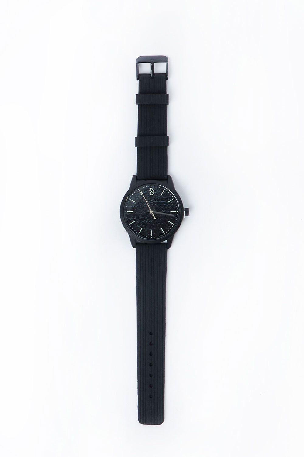 Sleek black matte watch from Luke 1977 featuring a textured print sundial with batons and three hands. The silicone strap and the iconic lion head logo add a classic touch. Perfect for casual and smart-casual wear.