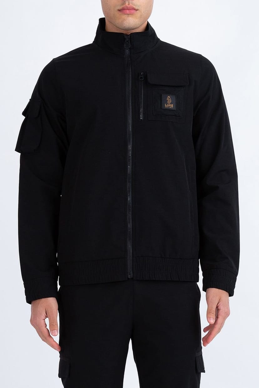 Technical zip-through jacket in black featuring a funnel neck and reverse ribtech nylon fabric. Designed with multiple pockets and matte trims, it includes the brand's iconic LUKE EST. 1977 woven badge.