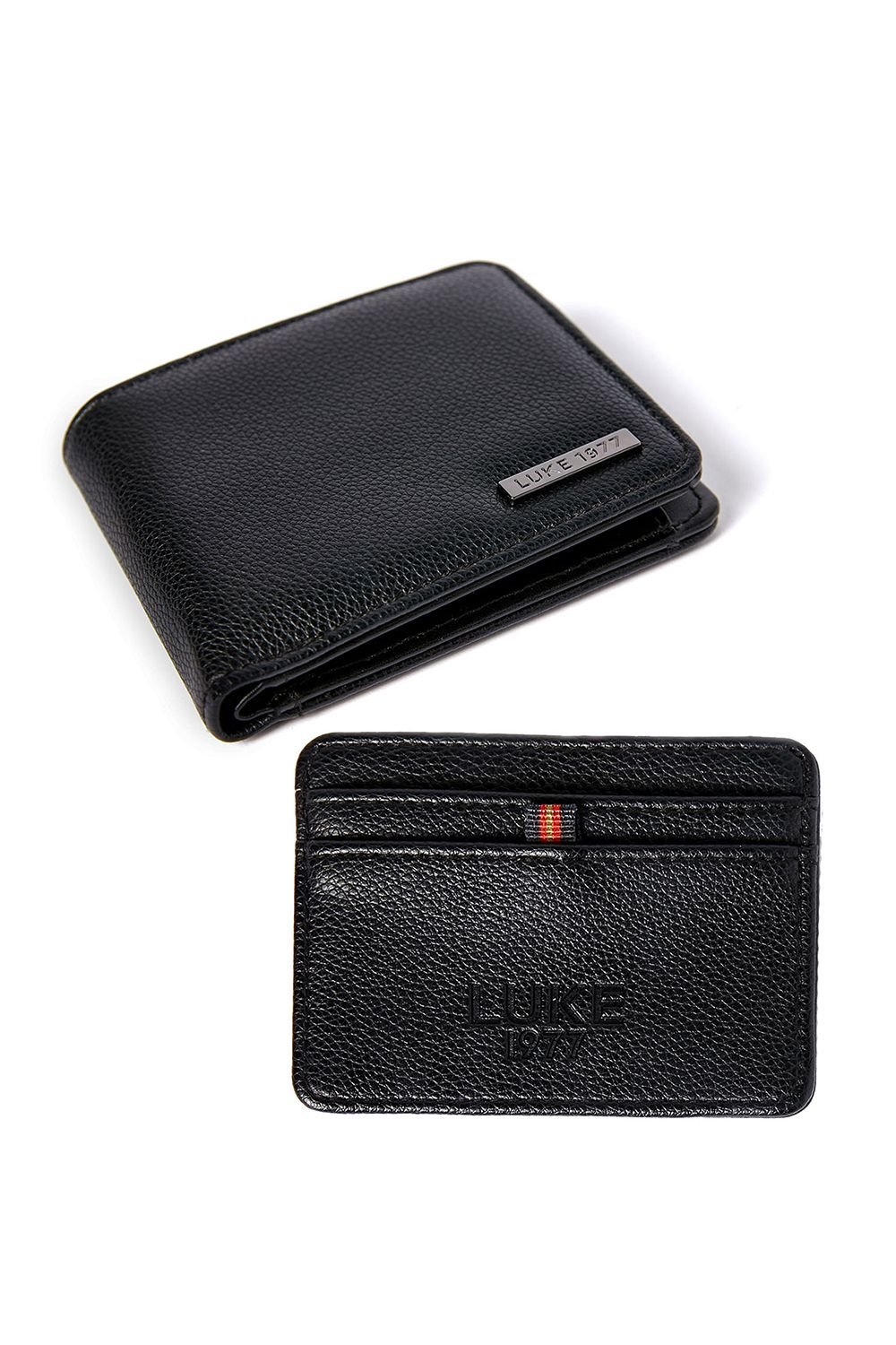 Elegant black leather wallet and card holder set from Luke 1977. The bi-fold wallet features a sleek design with a silver logo detail, while the card holder complements it with a matching embossed logo. Ideal for everyday use or as a stylish gift.