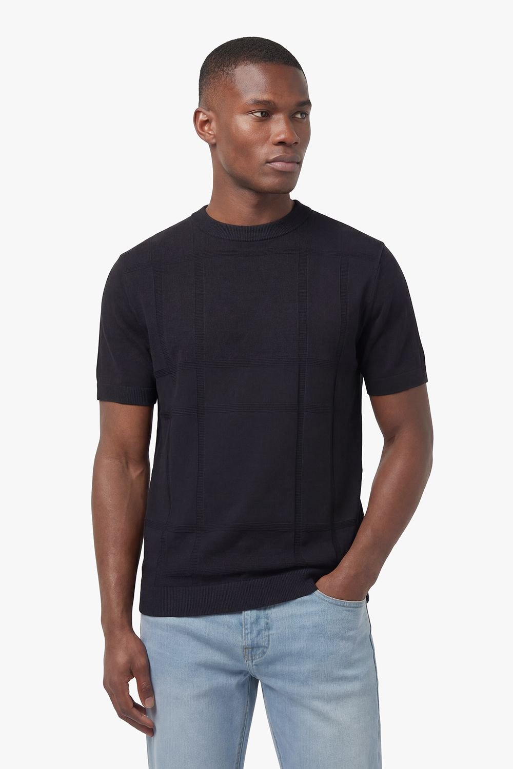 Stylish knitted crew neck tee from LUKE 1977. Crafted from tonal textured check cotton yarn, it features a subtle LUKE 1977 metal bar at the left hem. Perfect for a regular fit and modern style.
