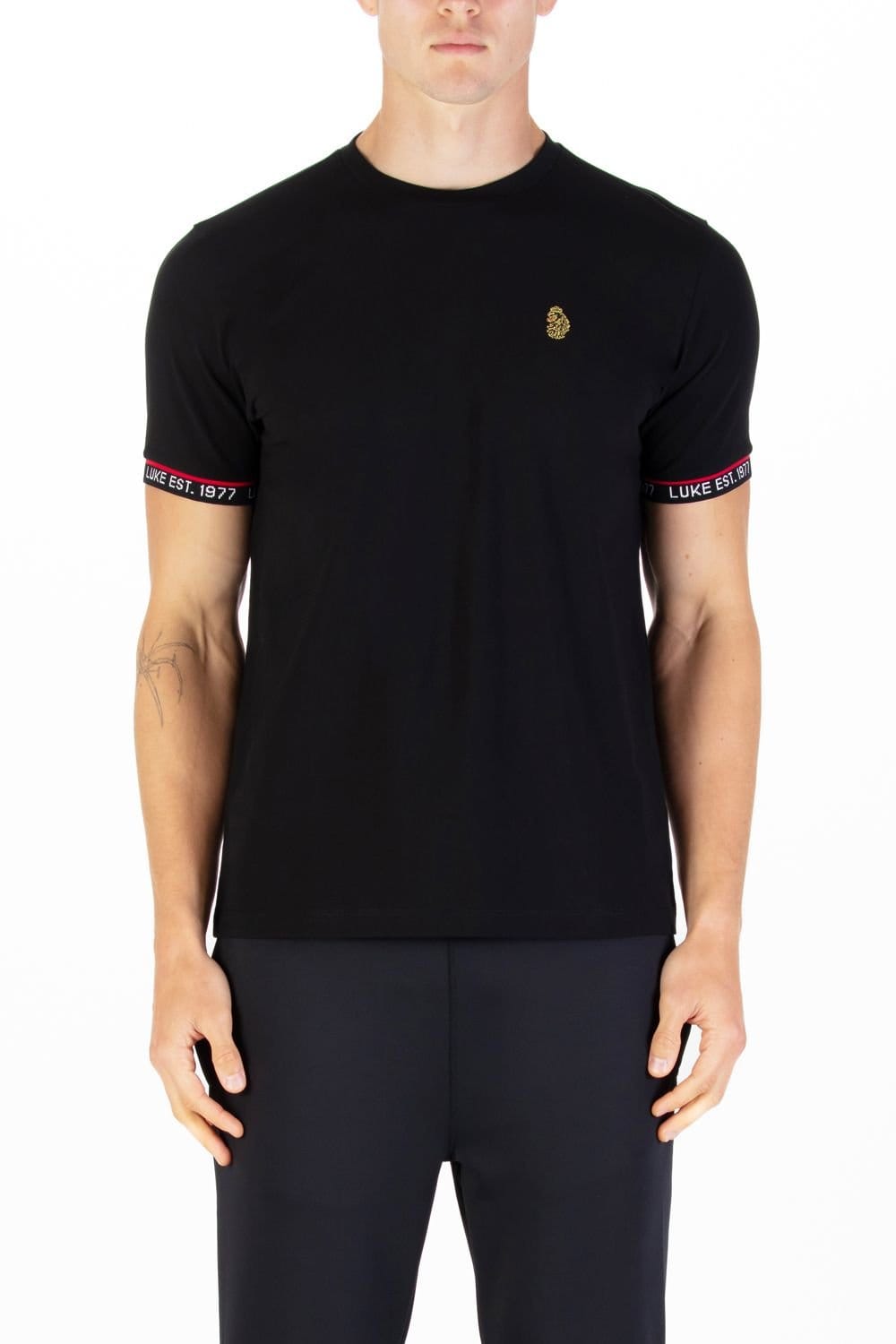 Stylish black t-shirt from LUKE 1977. Made from a luxury cotton blend, it features a soft rib crew neck and rib cuffs. The sleeve cuffs have the text 'LUKE EST. 1977' printed, and the iconic LUKE lion head embroidery is on the left chest. Perfect for casual wear.