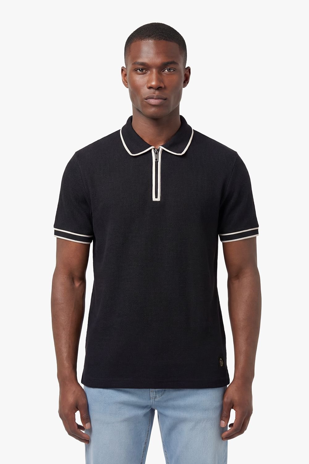 Stylish black waffle polo from LUKE 1977. Features a zip neck, contrast piping, and a lion head badge. Perfect for a smart-casual look.