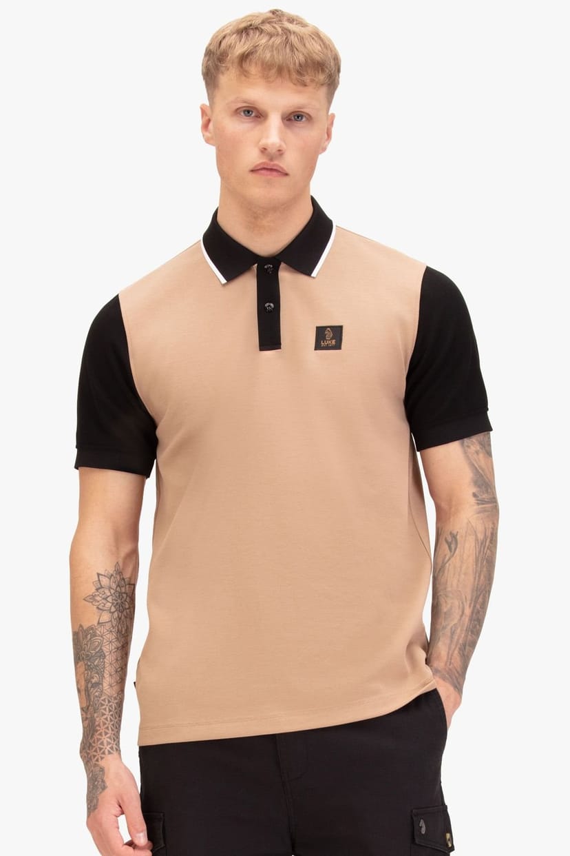 Stylish colour block polo from LUKE 1977 in brown Intertech Pique. Features a regular fit, shiny military buttons, and a subtle check print on the underside of the placket. Perfect for smart-casual wear.