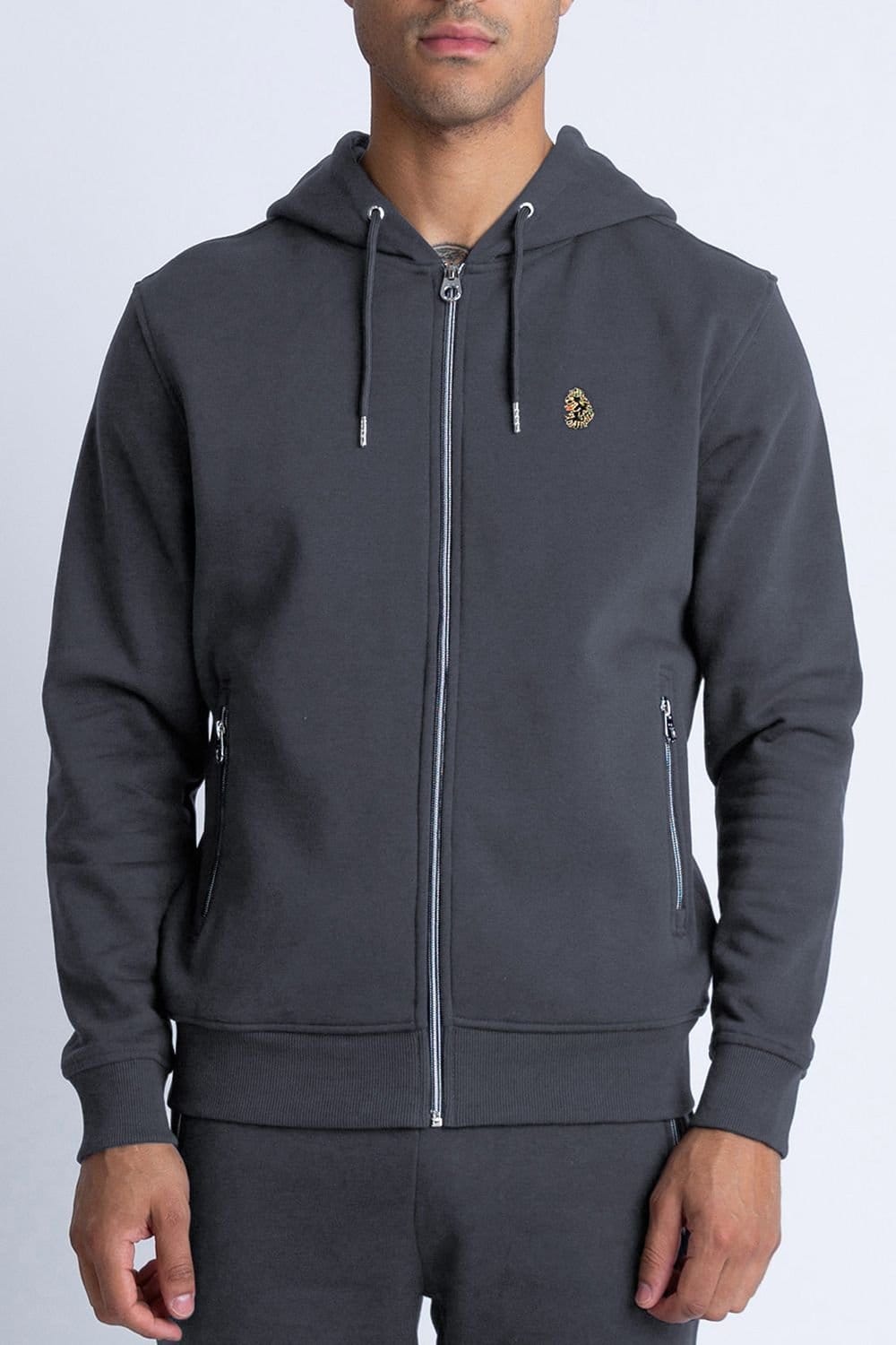 Stylish Luke 1977 Berlin 1000 Zip Hoodie in charcoal featuring a cotton fleece construction for warmth. It boasts a full-zip front, ribbed trims, and a chrome zip closure. The left chest is adorned with the brand's iconic lion head embroidery.