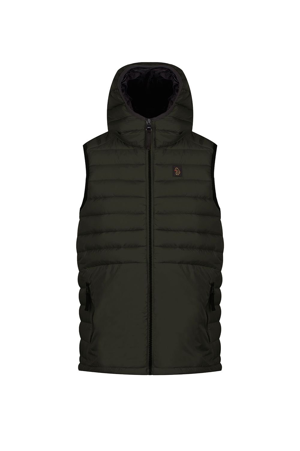 This dark green hooded gilet from Luke 1977 is fully lined and padded with fibres for warmth. It features dark pewter trims and lower zip pockets for practicality. Ideal for everyday wear.