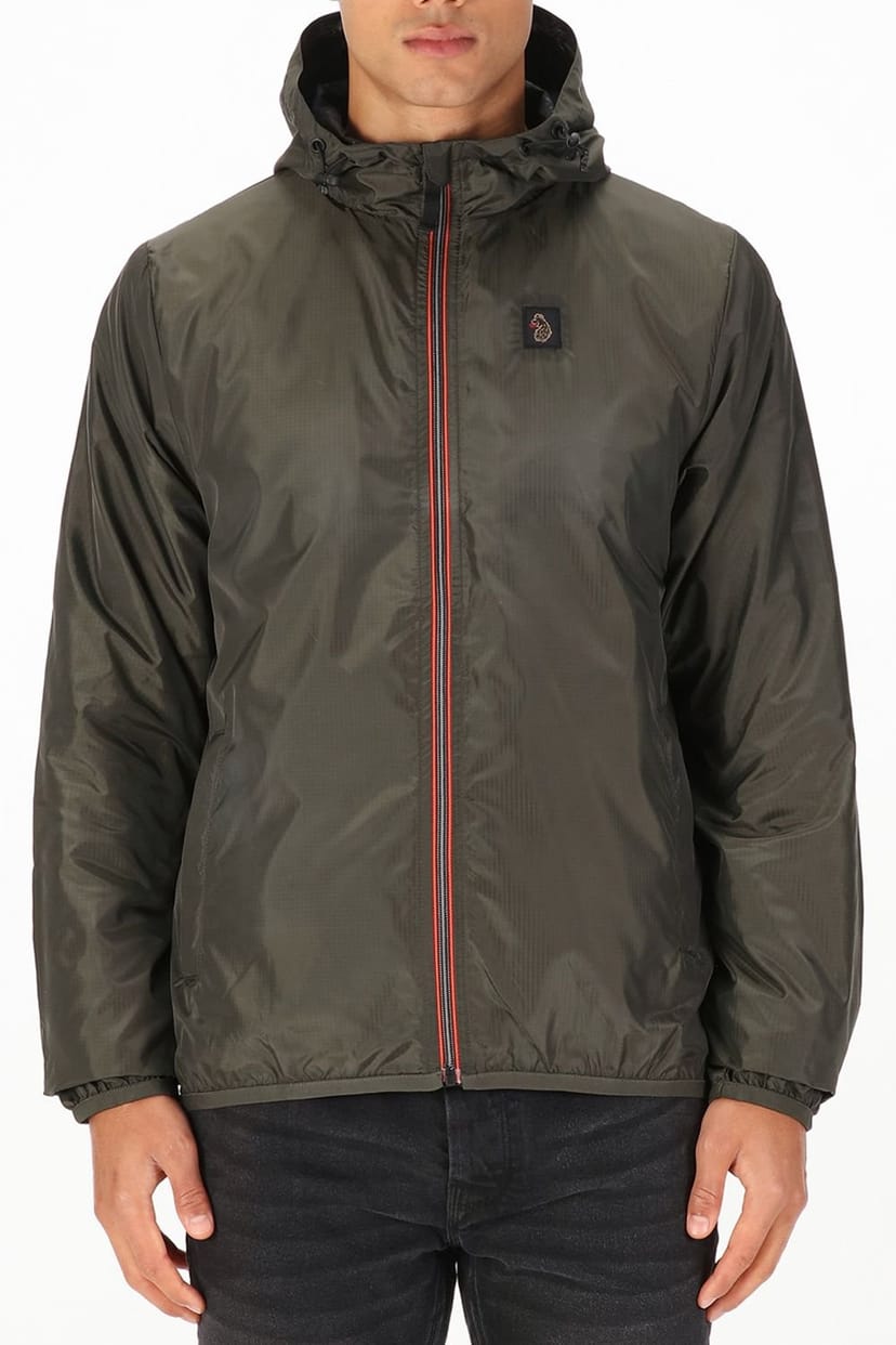 Luke 1977 presents a showerproof jacket in dark green crafted from lightweight nylon. It features a hooded design, breathable mesh lining, and a front zip closure with striped zip tape. The jacket includes two lower zip pockets for added utility.
