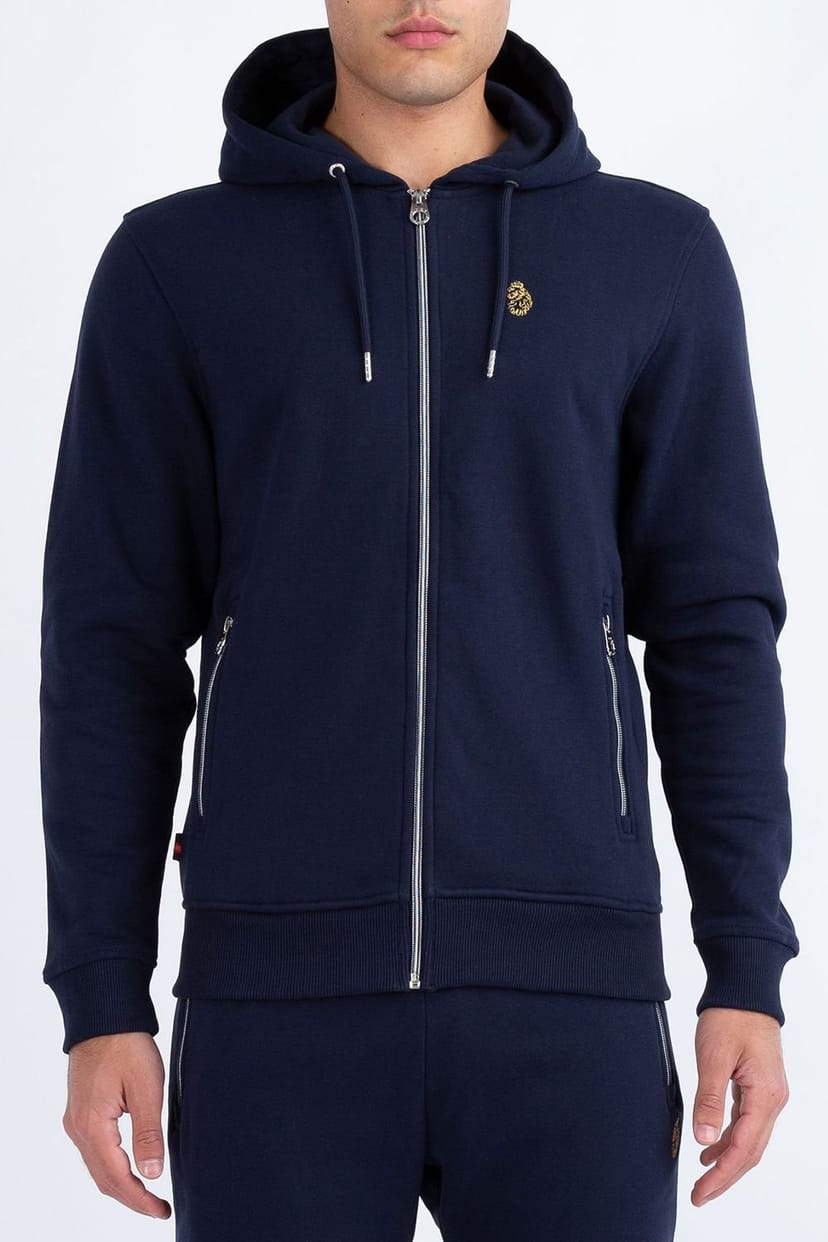 Stylish zip-through hoodie from Luke 1977 in dark navy. Made from cotton fleece for warmth, it features a chrome zip closure and ribbed trims. The iconic lion head embroidery adds a distinctive touch on the left chest.
