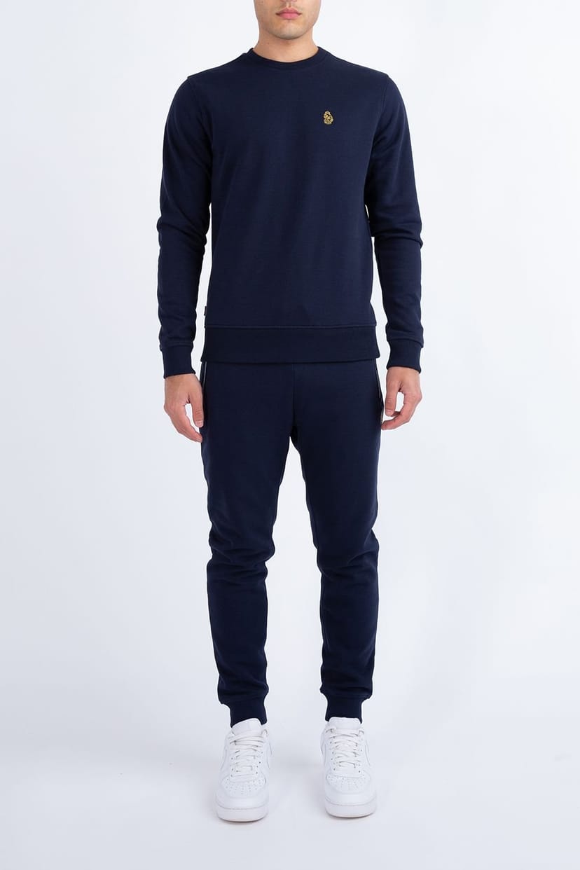 Stylish dark navy tracksuit set from LUKE 1977. Made from cotton fleece, it offers warmth and comfort. The crew neck sweatshirt features soft rib trims and the brand's iconic lion head embroidery on the left chest. Pair with matching navy joggers for a complete look.