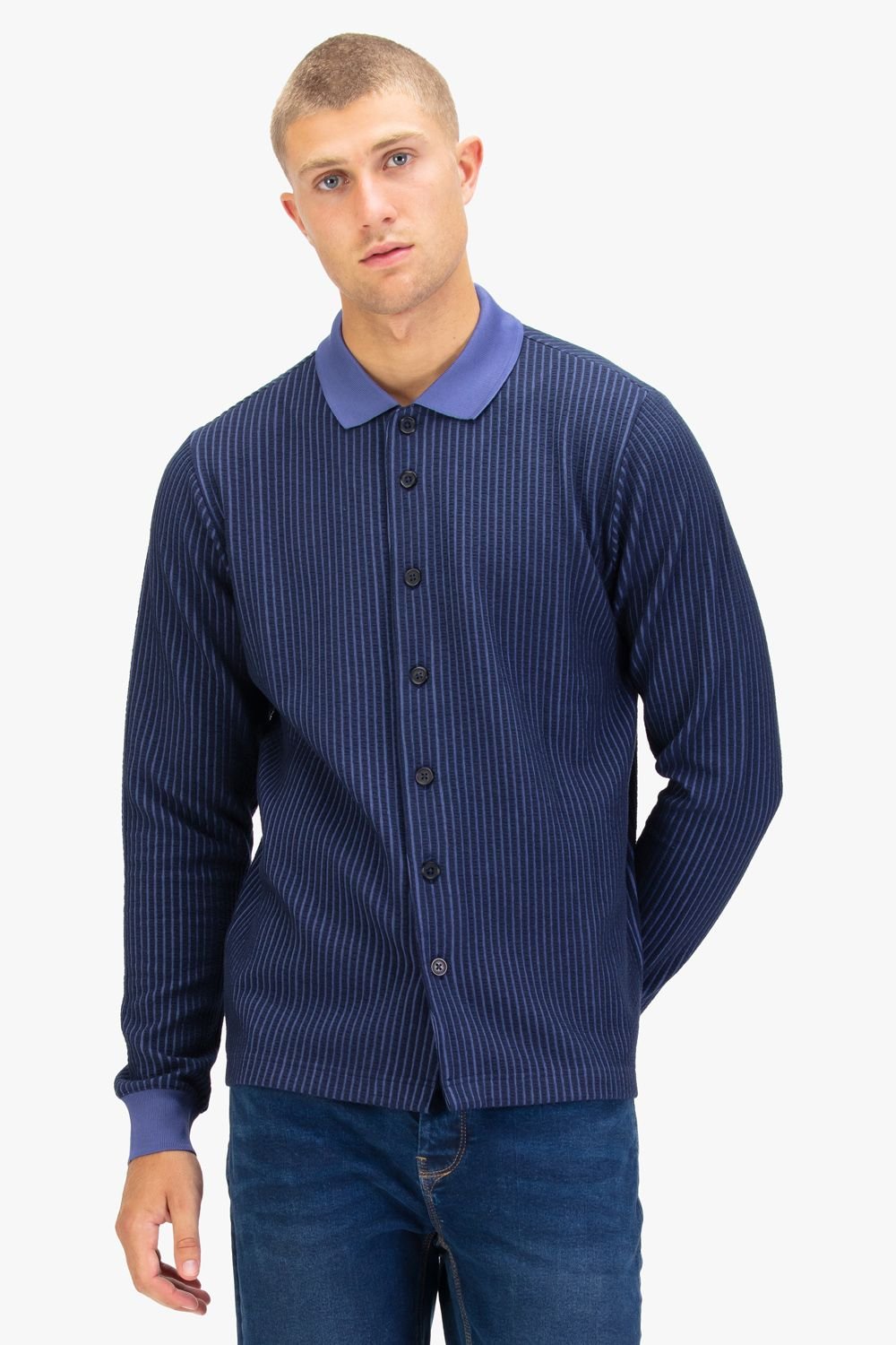 Stylish long-sleeve polo shirt in dark navy jacquard fabric. Features a contrast rib collar and cuff, branded buttons, and a metal rivet. Perfect for a smart-casual look.