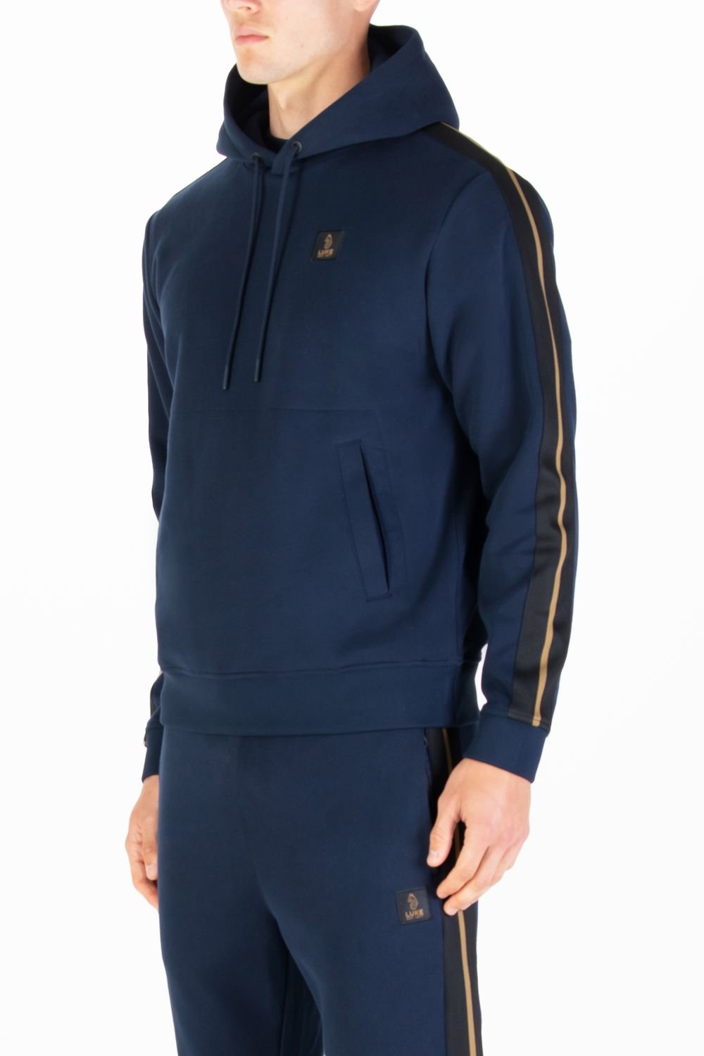 Elegant dark navy hoodie from Luke 1977 featuring premium vintage tricot fabric. Soft rib trims and iconic gold tape details on the sleeves add a touch of luxury. Perfect for casual, everyday wear.