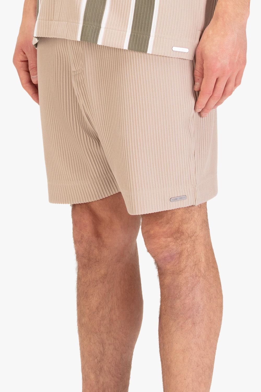 Lightweight Luke 1977 men's shorts in ecru with a ribbed texture. Features a button and zip closure and a subtle LUKE 1977 branding detail. Perfect for a casual summer look.