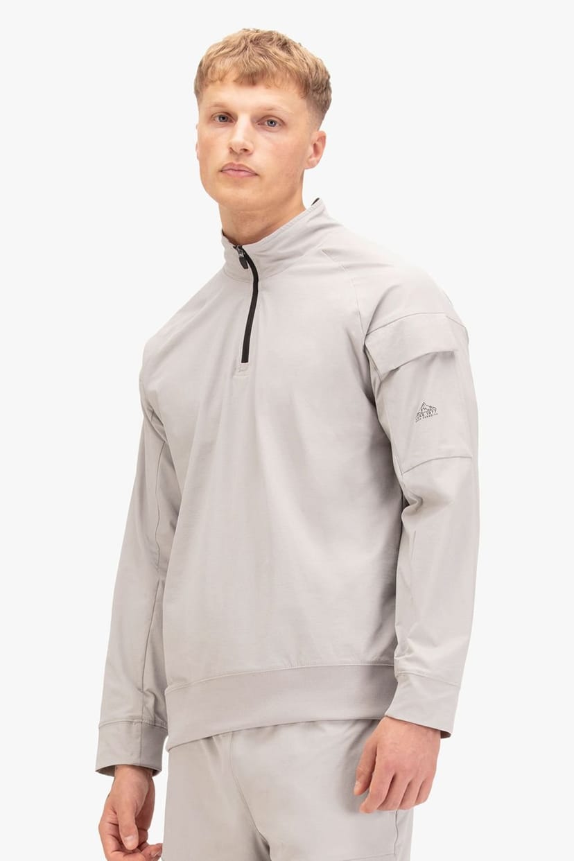 This Luke 1977 funnel neck sweatshirt in light grey is crafted from tech stretch performance nylon. It features a central technical quarter zip, a clean patch pocket on the left sleeve, and an ergonomic cut and sew sleeve panel for a comfortable fit. Ideal for both streetwear and outdoor activities.