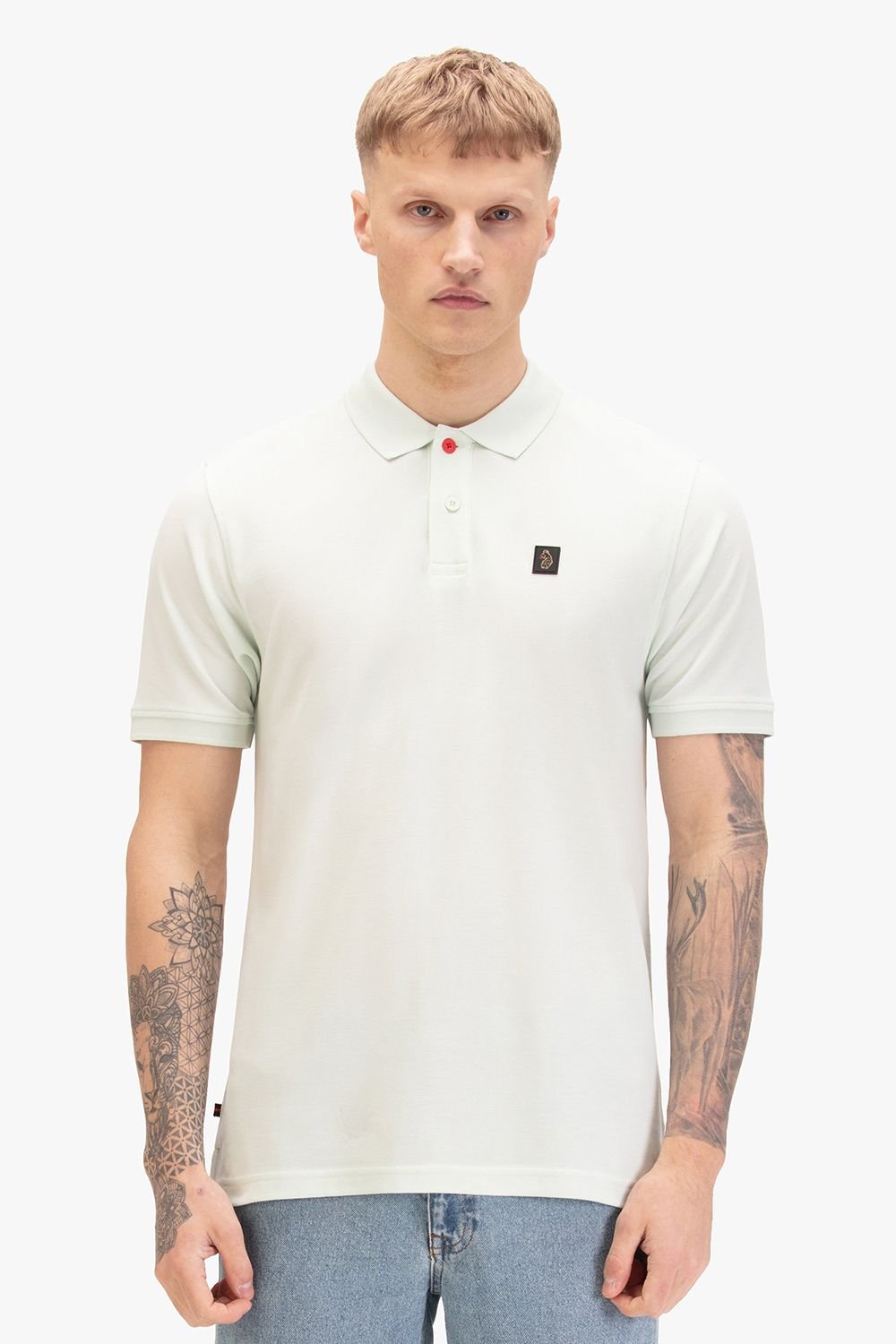 Sporty Luke 1977 polo shirt in pale green crafted from luxurious cotton pique. Features a classic collar and front button placket with a statement red top button. Complete with a LUKE 1977 lion head rubber badge. Perfect for casual, off-duty looks.