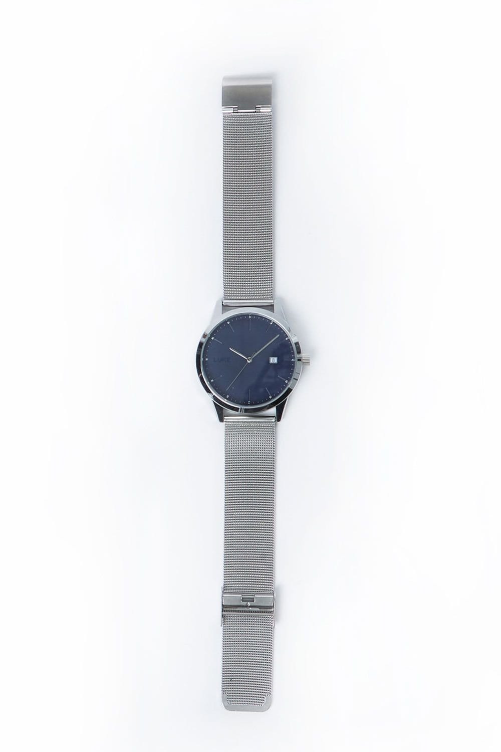 Elegant Luke 1977 men's watch with a black dial and silver mesh strap. Features the iconic LUKE logo and a date window. Perfect for a modern and stylish look.