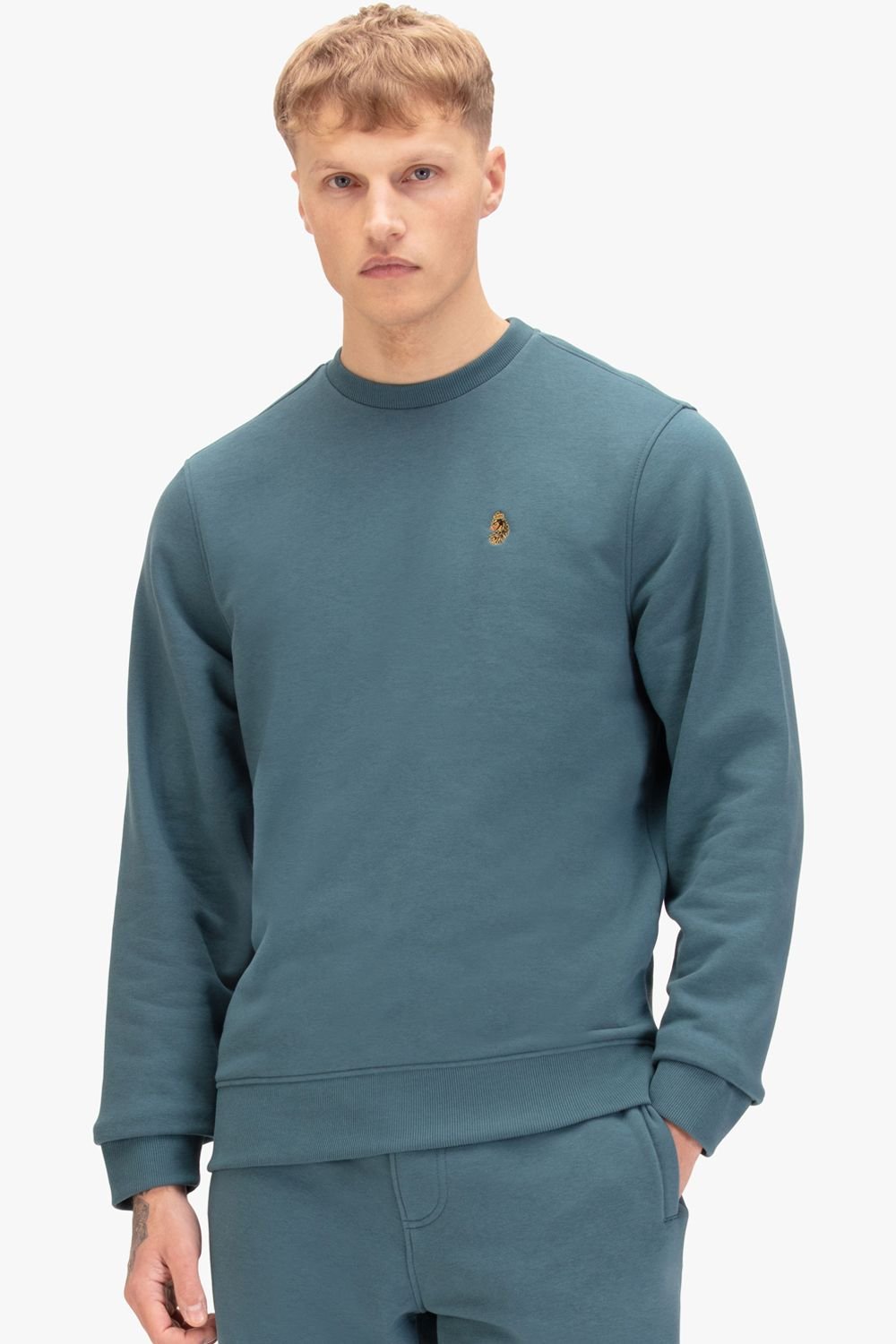 Stylish teal crew neck sweatshirt from Luke 1977, crafted from a cotton/fleece blend for warmth. Features ribbed trims and the brand's iconic lion head embroidery on the left chest. Perfect for casual wear.