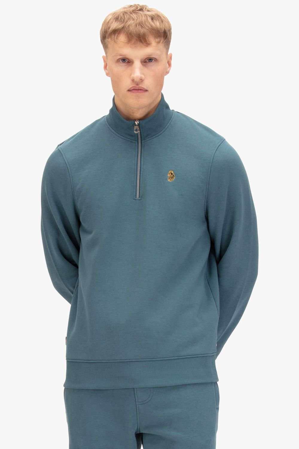 Stylish Teal fleece 1/4 zip sweater from Luke 1977. Featuring a funnel neck, ribbed neck, cuff, and hem, and a central chrome quarter zip. Adorned with the brand's iconic lion head embroidery on the left chest.