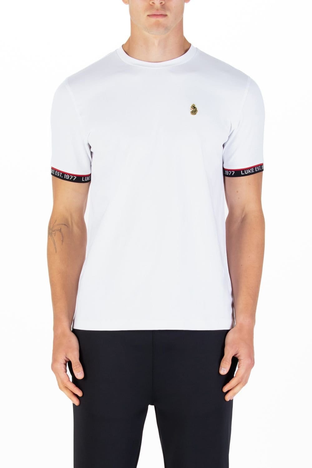 Stylish Luke 1977 men's t-shirt in white. Crafted from a luxury cotton blend, it features a soft rib crew neck and rib cuffs. The sleeve cuffs display the LUKE EST. 1977 printed text, and the look is completed with the brand's iconic LUKE lion head embroidery on the left chest.