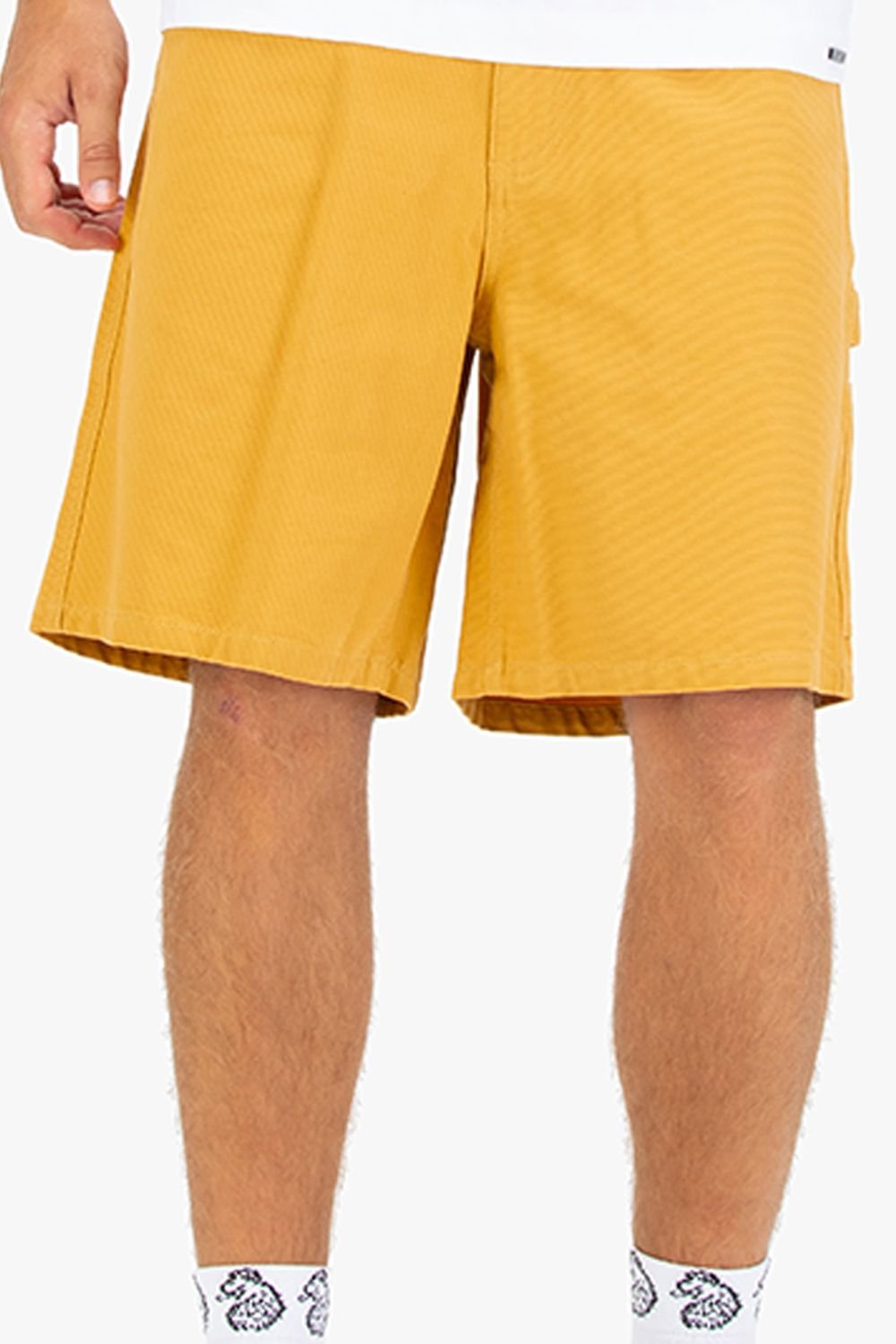 Stylish Luke 1977 Molfre carpenter shorts in vibrant yellow. Made from 100% cotton canvas, these shorts offer a comfortable and durable fit. Featuring classic workwear elements like two front pockets, a lower leg pocket, and two open back pockets.