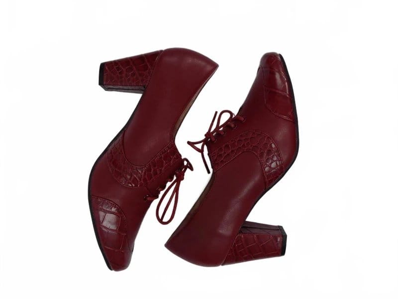Victorian-inspired Lulu Hun burgundy lace-up shoes with a round toe and crocodile-textured leather upper. Perfect for adding a touch of steampunk flair to any outfit.