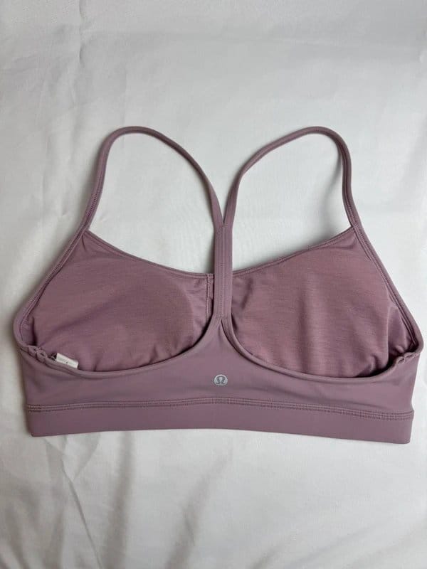 Lululemon sports bra in a soft dusty pink shade. Features a simple, flattering front with a delicate strappy back design. Comfortable and supportive—perfect for yoga, gym, or everyday wear.
