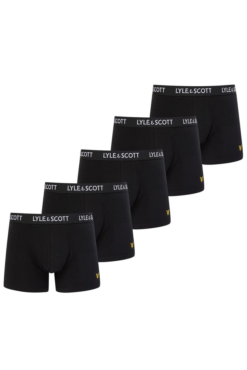 Set of five trunk-style underwear in black with signature Lyle & Scott branding. Made from a cotton-rich blend for everyday comfort, featuring a distinctive micro nylon waistband with repeated logo detail. The classic boxer trunk silhouette includes a subtle eagle emblem. Elastane content provides gentle stretch for an adaptive fit.