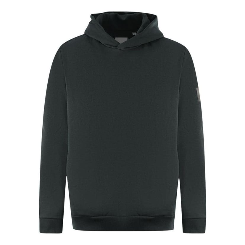 Stylish black cotton pullover hoodie with a relaxed fit and sewn-on hood. Features elasticated ribbed cuffs and two side pockets. Ideal for casual wear.