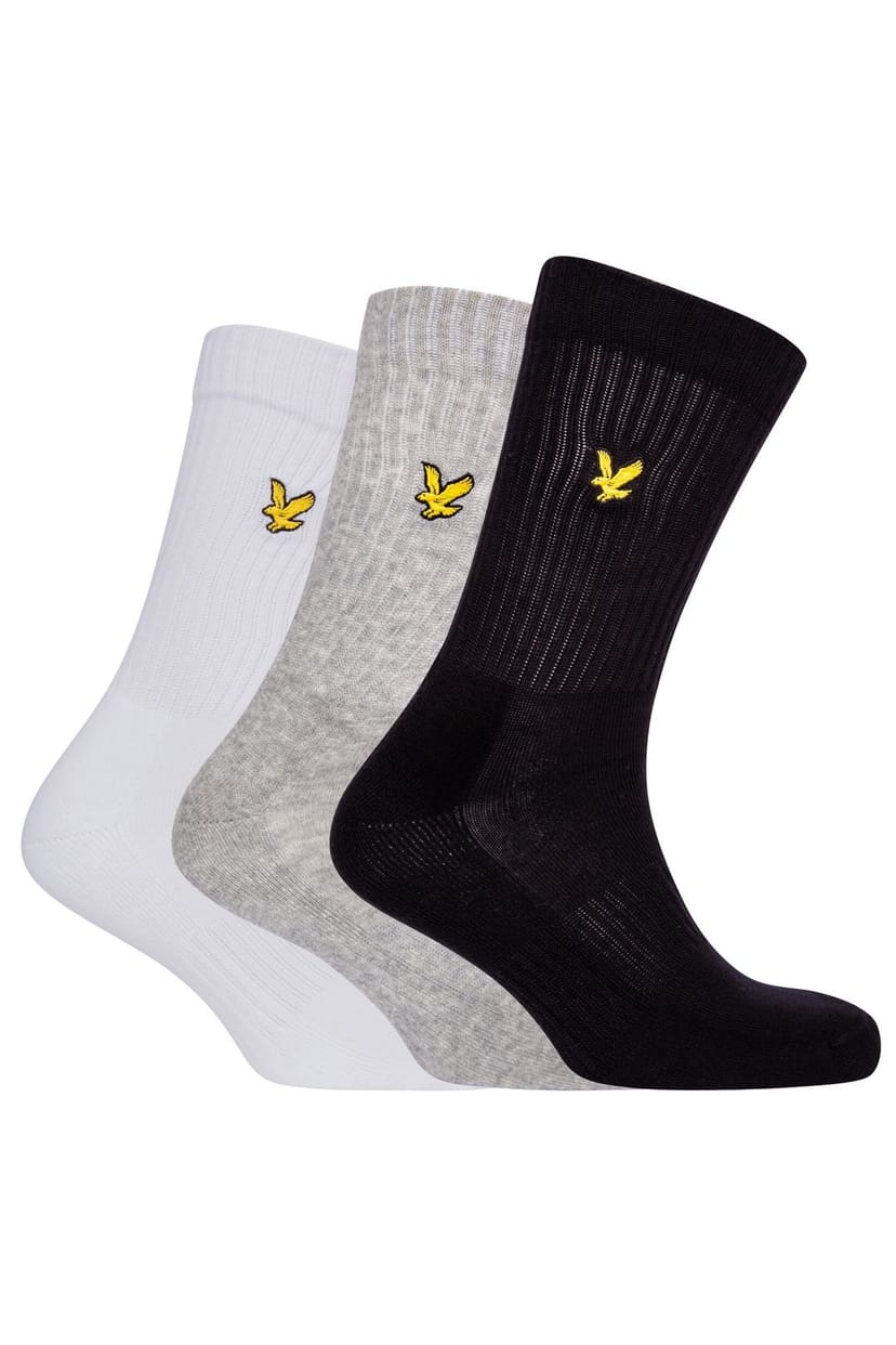 Three-pack sports socks featuring the iconic Lyle & Scott eagle emblem. Ribbed design provides enhanced comfort and support. Mid-calf length suitable for various sporting activities.