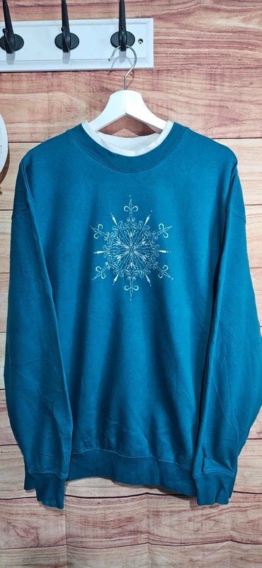 Turquoise Embroidered Snowflake Jumper — cozy vintage M & C Sportswear sweatshirt in a women’s UK size Large. Features a beautiful white embroidered snowflake design on a teal/blue background. Soft, comfy, and perfect for winter or casual everyday wear. Crafted from soft cotton with embroidered details, it’s a perfect addition to your winter wardrobe.