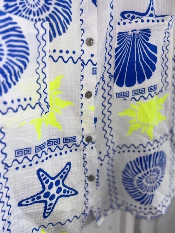 Vibrant summer shirt and shorts set in blue and neon yellow featuring a starfish, sun, and shell print. Made from 100% Italian cotton, this set is perfect for holidays and casual outings.