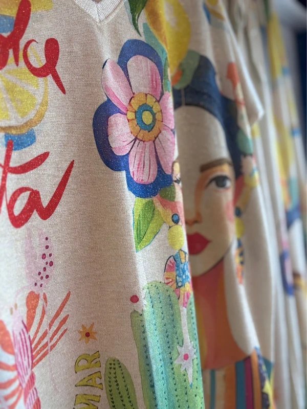 This shimmering lurex co ord set features a short sleeve top and wide leg trousers in a stunning gold print. Made in Italy, it's perfect for spring and summer with its stretchy, lightweight, and comfy fabric.