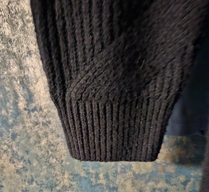 Classic, easy-to-wear style with a ribbed knit texture and subtle diagonal panel detail on the front. Long sleeves and a high neckline make it perfect for autumn/winter or layering.