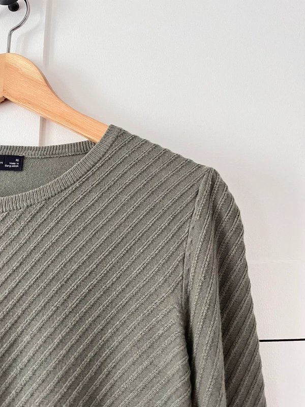 Designed with khaki green, patterned ribbed, round neck, long sleeve, thin knitted fabric, this jumper is perfect for layering during cooler months.