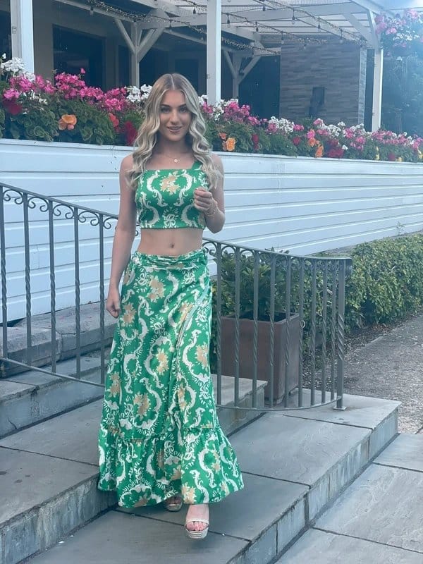 This Maddison co-ord set features a green floral crop top and a matching long skirt. The crop top has a halter neckline and adjustable straps, while the skirt has a high waistband and flowing silhouette. Perfect for a casual yet stylish look.