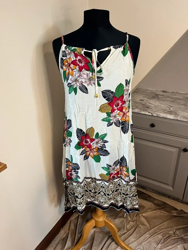Step into summer with this beautiful, flowing midi dress! This dress features a gorgeous floral print with vibrant red, orange, and yellow flowers set against a white background, creating a cheerful and eye-catching design. The dress boasts a flattering V-neckline with a delicate drawstring tie, allowing for a customizable fit. The sleeveless design and lightweight fabric make it ideal for warm weather, while the midi length adds an elegant touch.