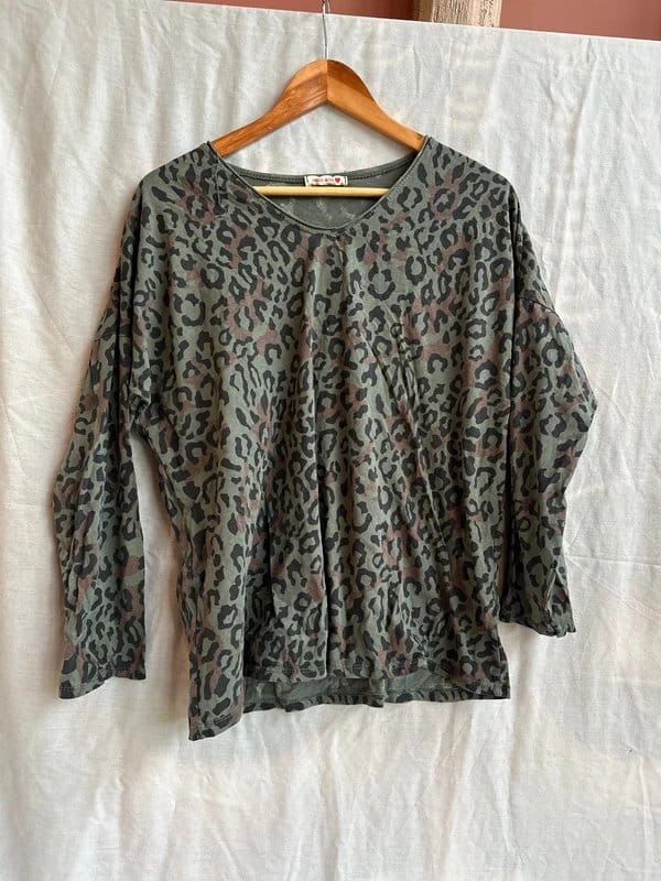 The Made With Love Khaki Leopard Loose Top is available in sizes M.