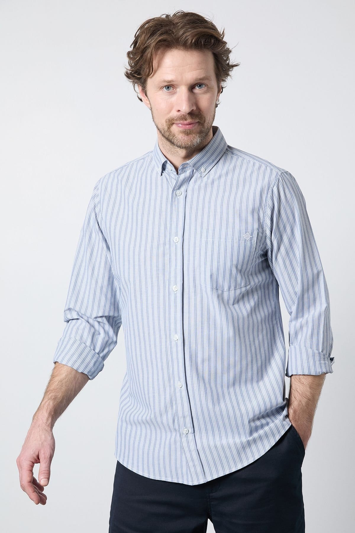 Slim fit button-up shirt with classic vertical stripe pattern. Button-down collar for a refined, structured appearance. Convenient chest pocket detail adds functionality. Cotton fabric ensures breathability and comfort for all-day wear. Versatile long sleeves that can be worn rolled up for a more casual look.