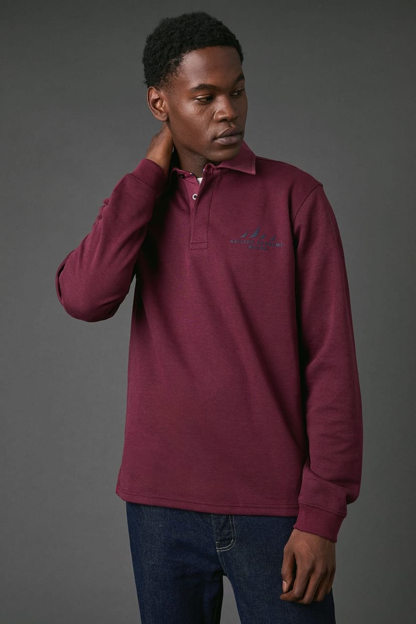 Classic rugby top in burgundy featuring the Sailing Academy embroidered logo. Quarter-zip design with a traditional fold-down collar. Comfortable relaxed fit with ribbed cuffs for a secure feel. Ideal for cooler weather.