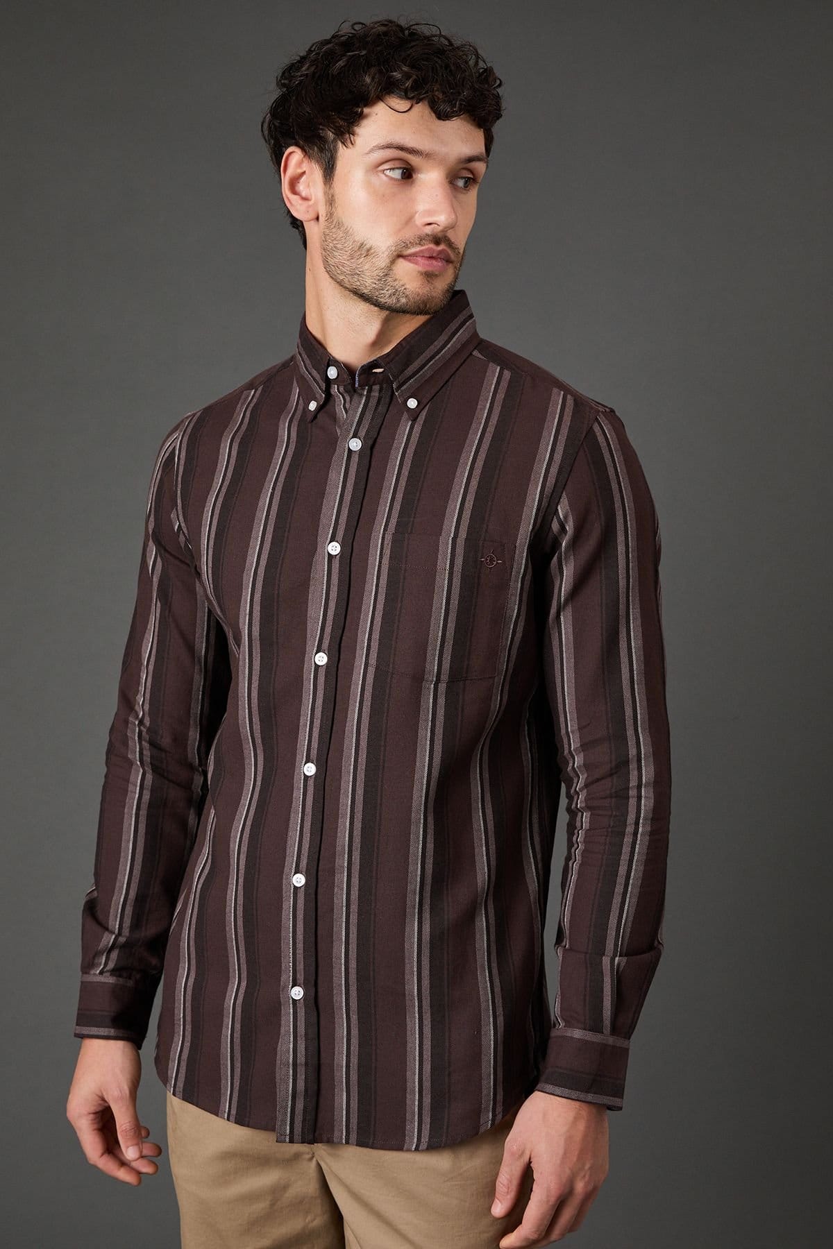 The Maine Men's Burgundy Stripe Long Sleeve Shirt is ideal for casual, work, evening.