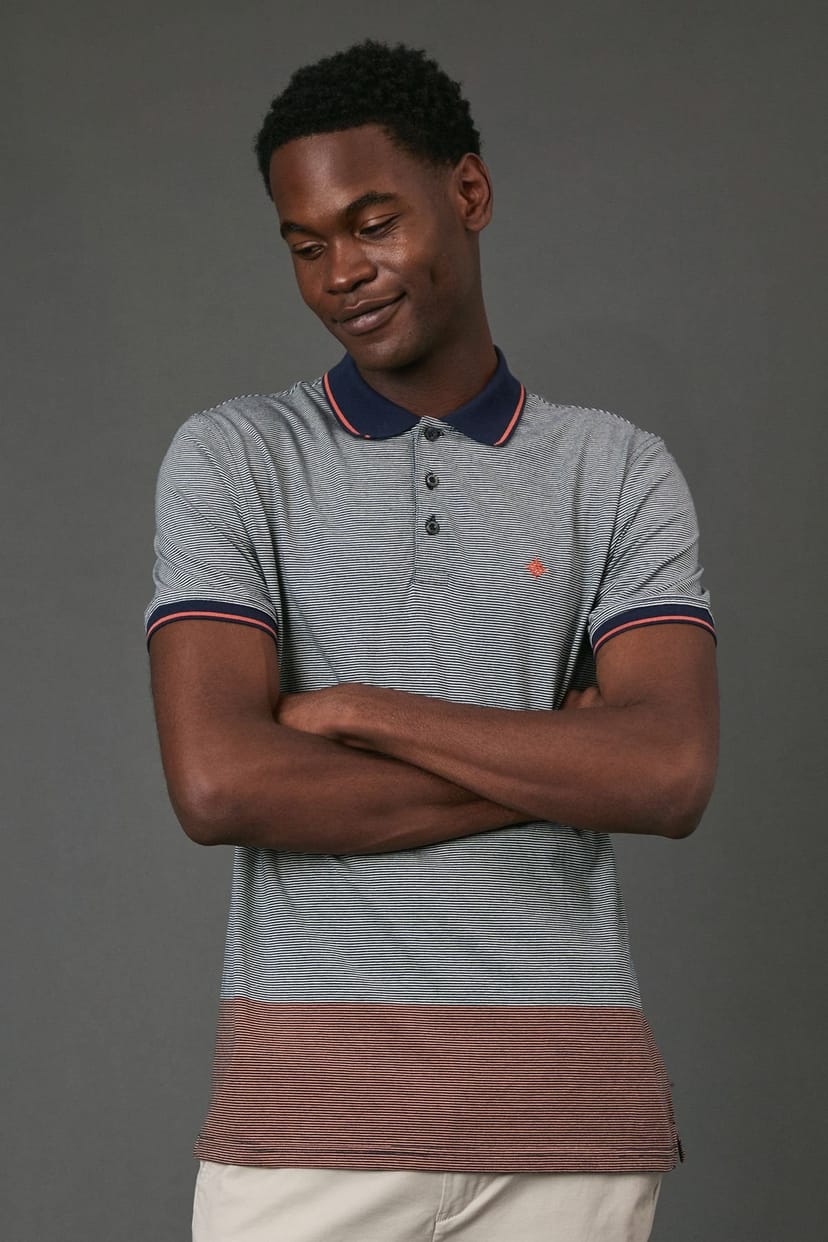 Sporty navy polo shirt with engineered stripe detailing on collar and cuffs. Contrasting colour block design at the hem adds visual interest. Classic three-button placket for adjustable fit. Subtle Maine logo embroidery on the chest.