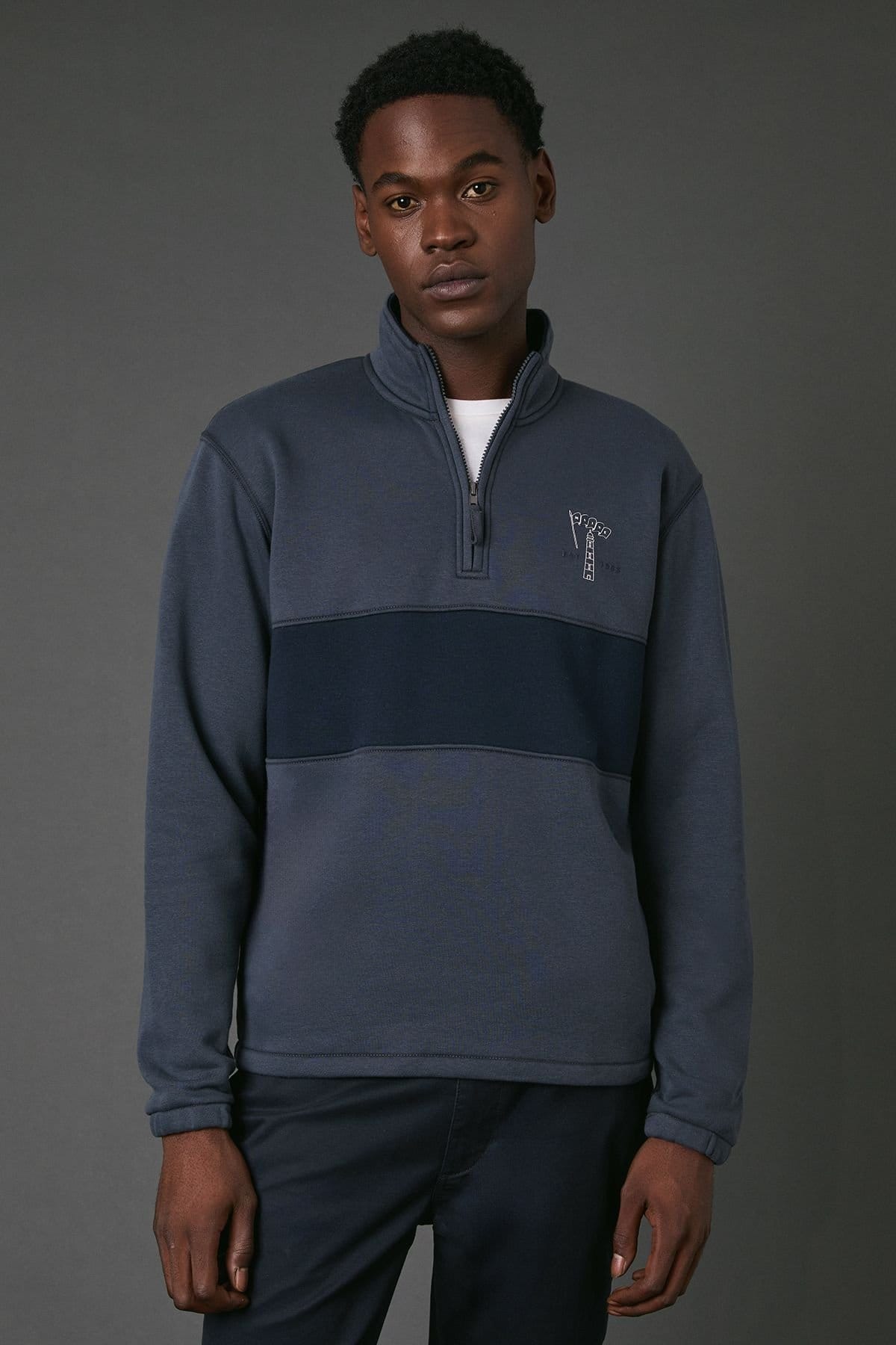Stylish navy half-zip jumper with a stand collar for added warmth. Features distinctive two-tone colour blocking and an embroidered lighthouse logo on the chest. Ribbed cuffs ensure a comfortable, secure fit. Ideal for layering in cooler weather.