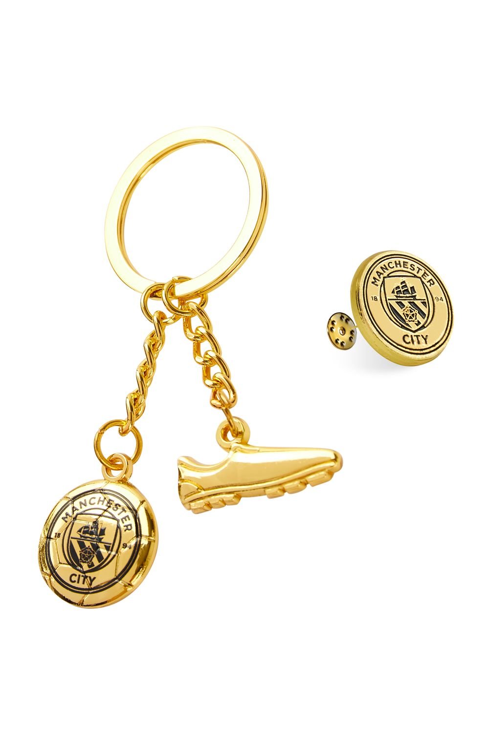 Show your team spirit with this Manchester City FC keyring and pin badge set. Featuring a gold football charm and football boot charm, along with the iconic Man City crest, this set is perfect for fans. Ideal for die-hard supporters, it's also an official merchandise.