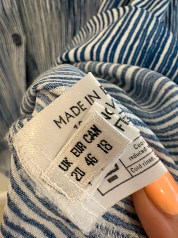 The Mandy Marsh Blue & White Striped Blouse Top Size 20 is made from cotton, polyester.