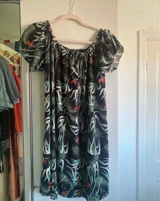 The Mango Off-Shoulder Floral Mini Dress in Coral Green is available in sizes M.