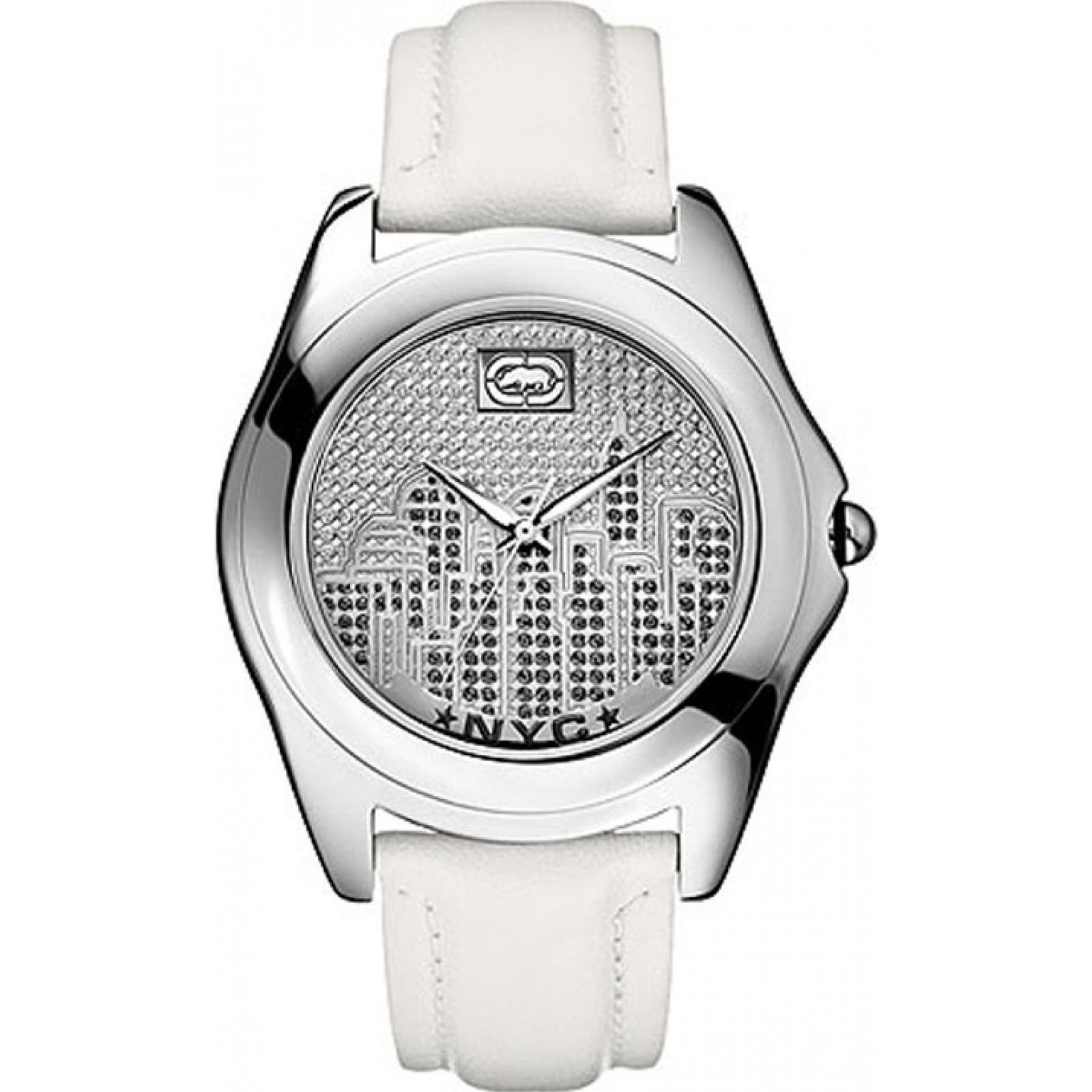 Sleek Marc Ecko men's watch with a white leather strap and a silver-tone dial featuring a city skyline design. Ideal for a modern and stylish look.