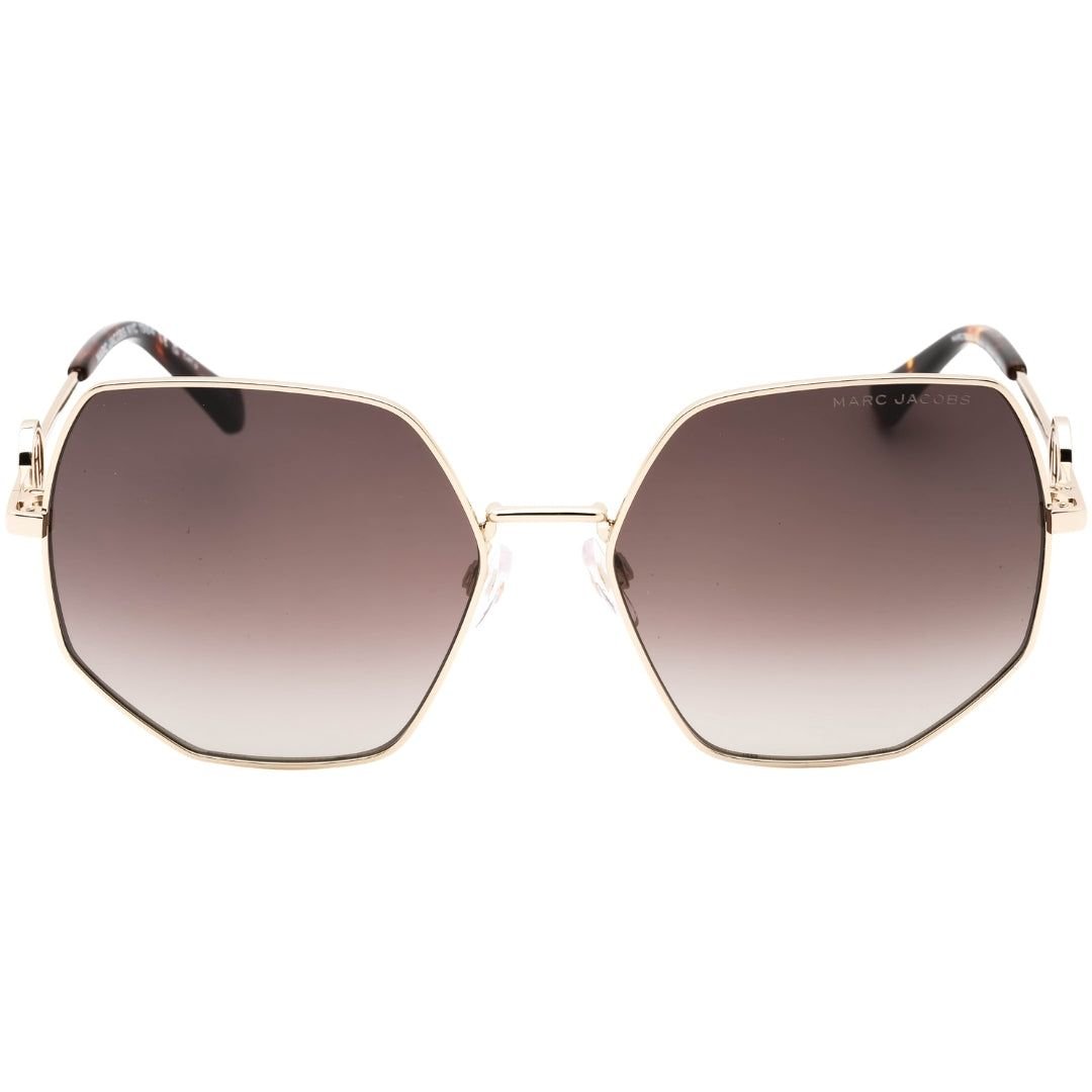 Stylish Marc Jacobs gold sunglasses with a lens width of 59mm, nose bridge width of 17mm, and arm length of 140mm. Features 100% UVA & UVB protection and comes with a sunglasses case, cleaning cloth, and care instructions.