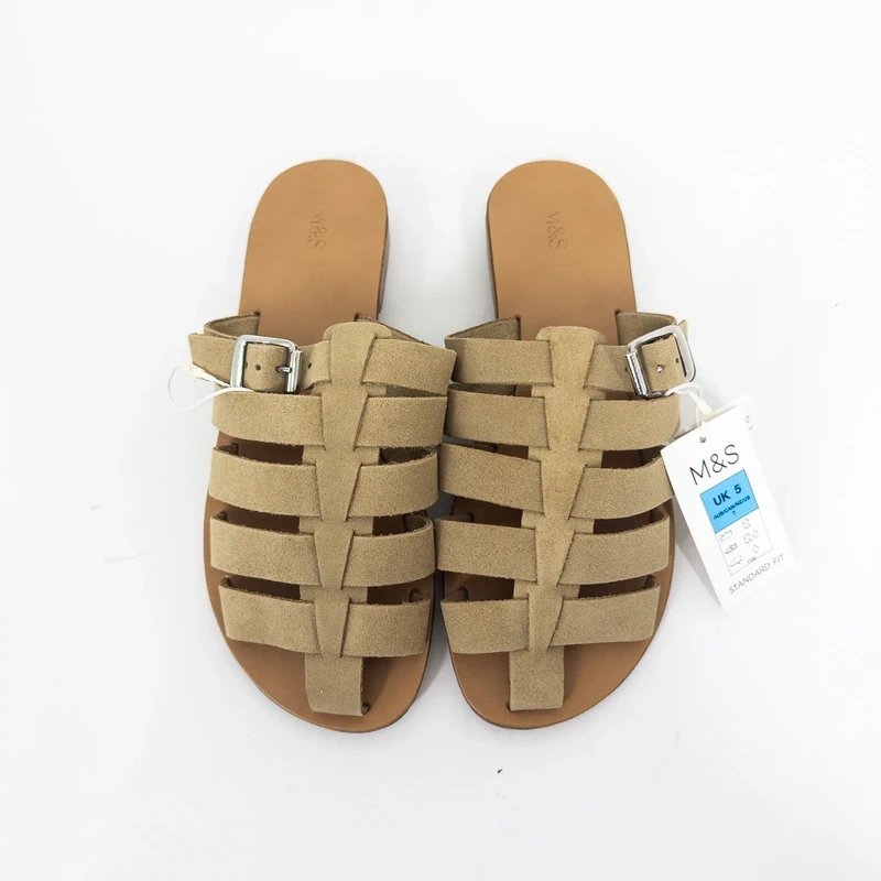 The Marks & Spencer Suede Gladiator Buckle Mule Sandals in Nude Beige is made from suede leather.