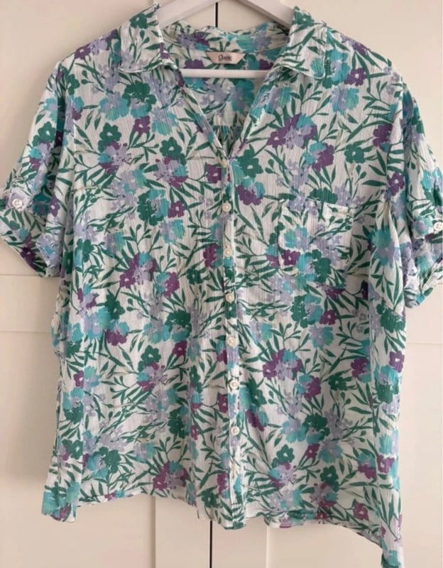 Charming vintage blouse from Marks & Spencer in a turquoise floral print. This button-up shirt features a relaxed fit and a short-sleeve design, perfect for casual and festival wear.
